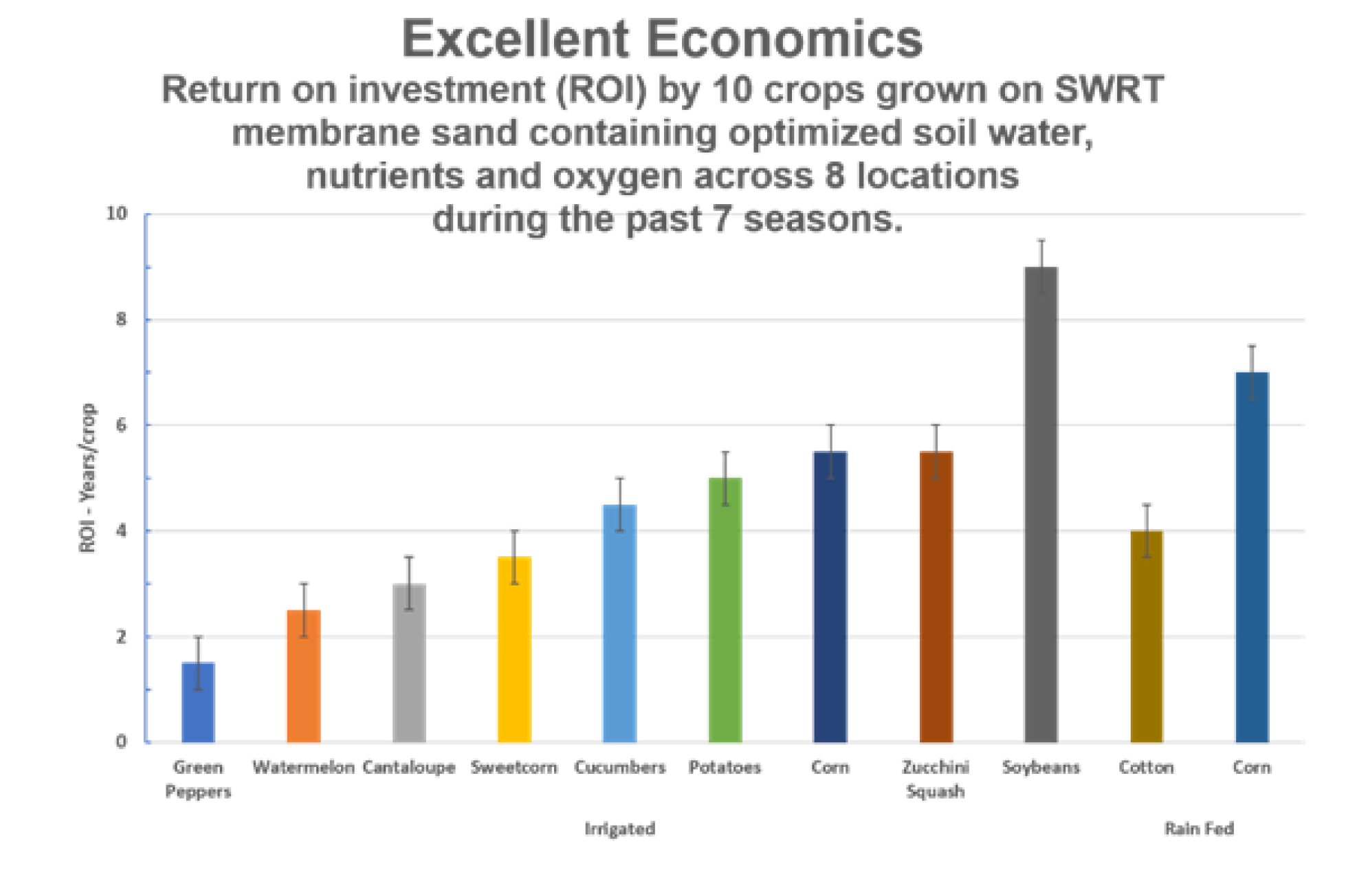 Assessment for 10 crops in the U.S. shows an ROI ranging from less than 2 years to about 9 years depending on the crops grown, with an average for these 10 crops of 4 years. Areas which have the ability to double crop would be proportionately less.
